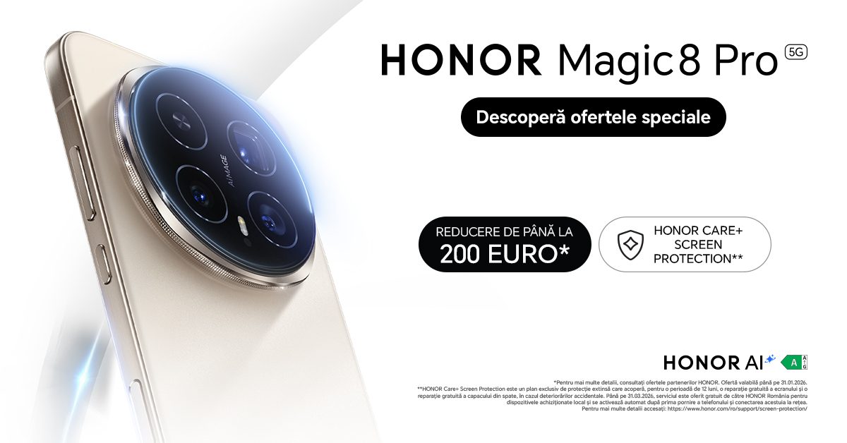 Până pe 31 ianuarie, HONOR oferă o serie de beneficii exclusive pentru Magic8 Pro, inclusiv o reducere de până la 200 de euro. În plus, dispozitivele achiziționate local și activate în rețea până pe 31 martie 2026 beneficiază și de HONOR Care+ Screen Protection*. Serviciul acoperă timp de 12 luni o reparație gratuită atât pentru ecran cât și pentru capacul din spate în cazul deteriorărilor accidentale, oferind un plus de siguranță în utilizarea de zi cu zi.